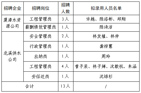 根據(jù)廈漳水資源公司、北溪供水公司2025年招聘公告,經(jīng)過報(bào)名、資格審查、筆試、面試等公開招聘程序,現(xiàn)將13位擬錄用人員進(jìn)行公示。公示時(shí)間從2025年4月16日開始,公示期為五個(gè)工作日。在此期間內(nèi),如有意見可通過來電、來信、來訪的形式反映情況。