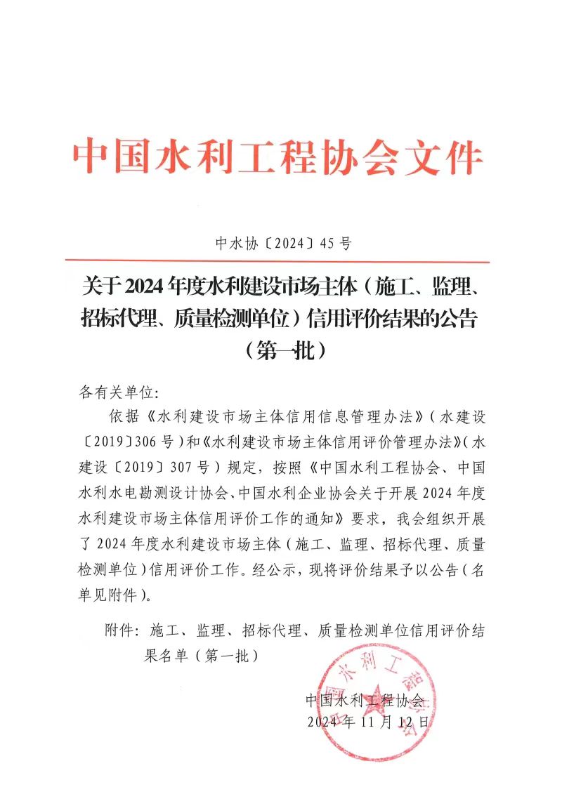 近日,中國水利工程協(xié)會公布2024年度全國水利建設市場主體信用評價結果名單,集團公司所屬水電建設公司獲評施工、監(jiān)理雙AAA級單位。