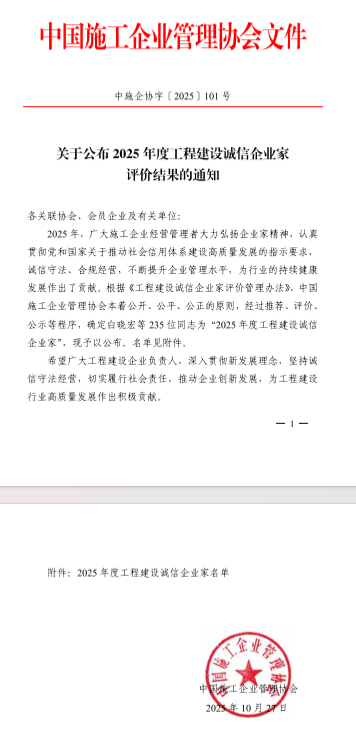 近日,中國(guó)施工企業(yè)管理協(xié)會(huì)正式公布2025年度工程建設(shè)誠(chéng)信典型企業(yè)及誠(chéng)信企業(yè)家名單。工程局公司憑借在誠(chéng)信經(jīng)營(yíng)、合規(guī)管理、技術(shù)創(chuàng)新等方面的卓越表現(xiàn),成功入選“2025年度工程建設(shè)誠(chéng)信典型企業(yè)”,工程局公司黨委書(shū)記、董事長(zhǎng)、總經(jīng)理潘木枝榮獲“2025年度工程建設(shè)誠(chéng)信企業(yè)家”稱(chēng)號(hào)。