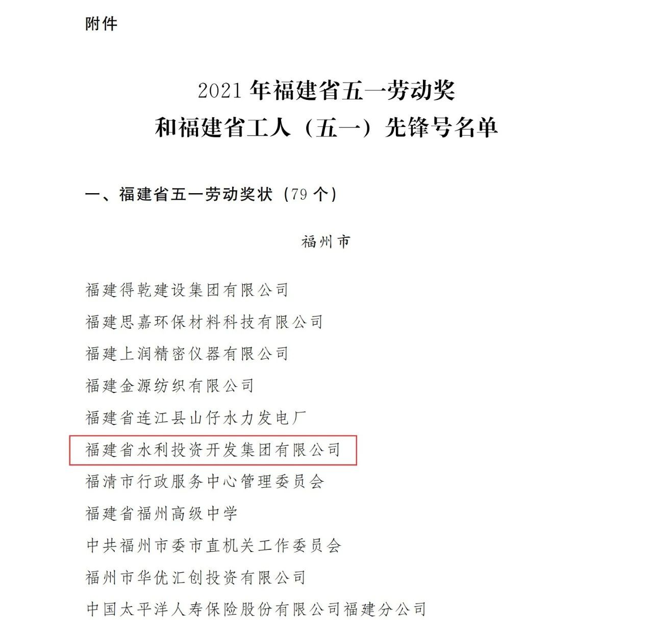 近日,省總工會通報表彰了2021年福建省五一勞動獎和福建省工人 (五一) 先鋒號,福建省水利投資開發(fā)集團有限公司榮獲福建省五一勞動獎狀。